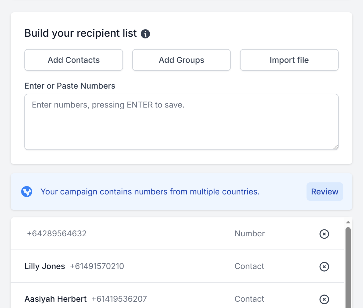If your recipient list contains numbers from a different country, they will appear as shown below and provide an opportunity for review.